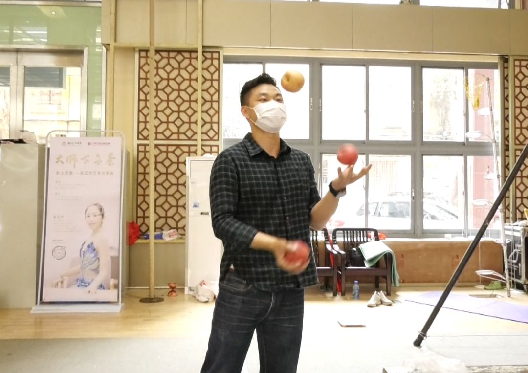 雜技演員金帥給網(wǎng)友們帶來隨時(shí)能練的“宅家技能”,3個(gè)蘋果輪流拋接,鍛煉靈活手技。