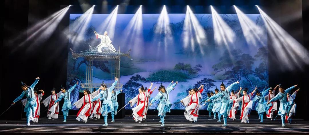 舞臺布景精致簡約,突出中國畫色彩、中國畫意境,金庸小說中的經(jīng)典情節(jié)和場景等在劇中都有精彩呈現(xiàn)。