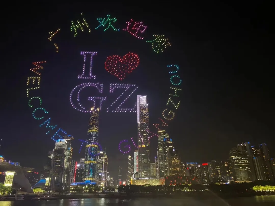 With the singing of "Blessing for a New Era", thousands of drones took off at the same time with different patterns. The host announced the official launch of the "Welcome to Guangzhou" series of activities. With the lighting of the Canton Tower and on both sides of the Pearl River, thousands of drones displayed the words "Welcome to Guangzhou" in sky, and the launching ceremony of the whole series of activities was successfully concluded in the brilliant music.